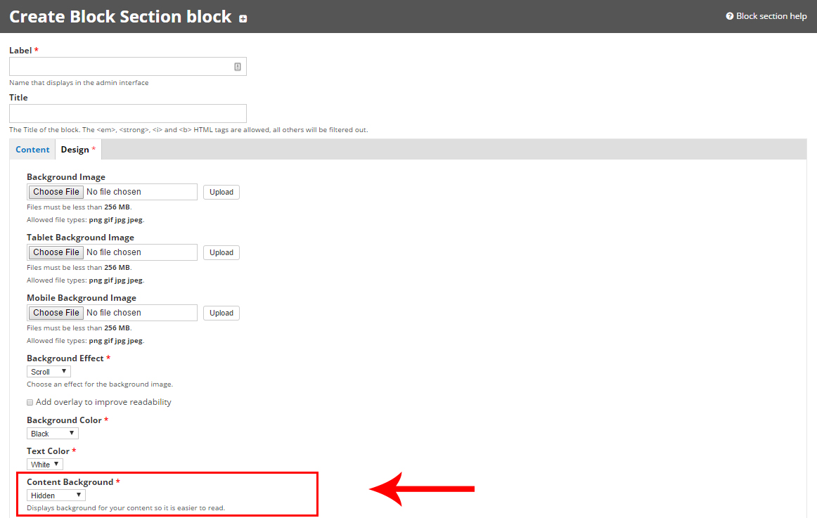 Not all text may be legible when placed over the background image, so there are some options in the Content Background drop-down to put a background behind your content to help the text stand out.